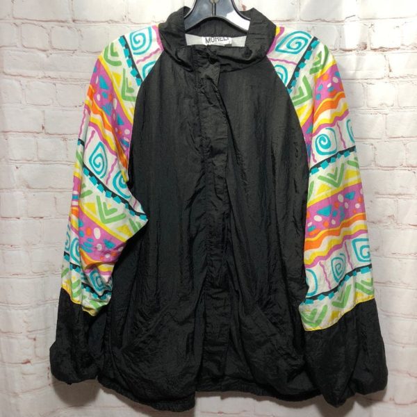 1980’s Mureli windbreaker jacket, nylon, color-block design with crazy geometric print in neon-colors and solid panels, black/green/yellow/purple/white/turquoise/orange, size L