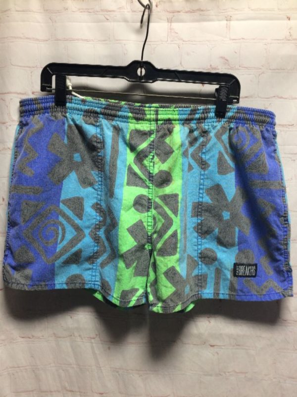 1980’s Fast Breakers shorts, cotton, drawstring waist, neon-colors, funky Saved By The Bell type print, neon green/blue/black, size M