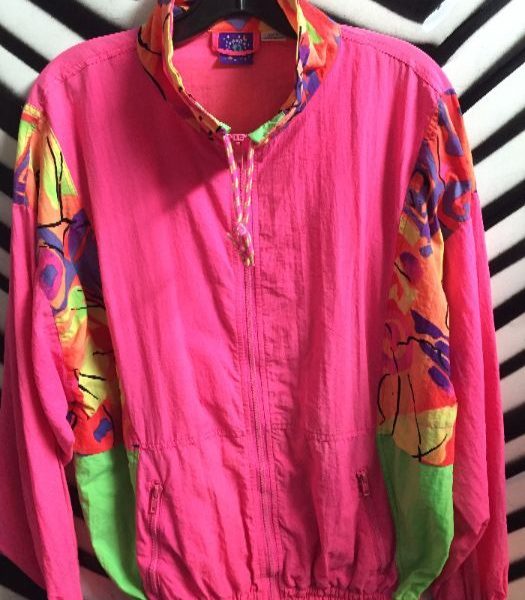 1980’s windbreaker, zip-up, crazy pattern trim, neon hot pink/multi-color, size M