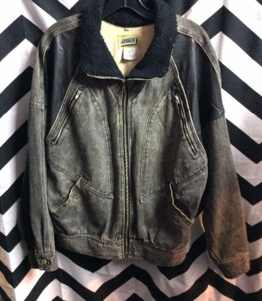 1980’S JORDACHE DENIM BOMBER JACKET – ZIPUP – LEATHER PANELS – SHERPA COLLAR