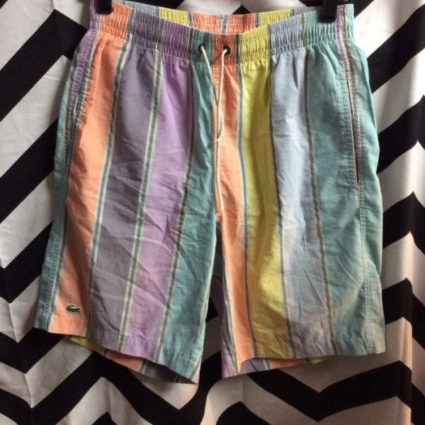 1980’s LaCoste swim trunks, pastel stripes, multi