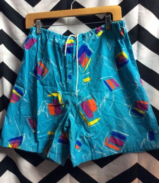 1980’S HARBOR ONE BEACH SHORTS, SAVED BY THE BELL PRINT DESIGN, RED/PURPLE/YELLOW/TURQ