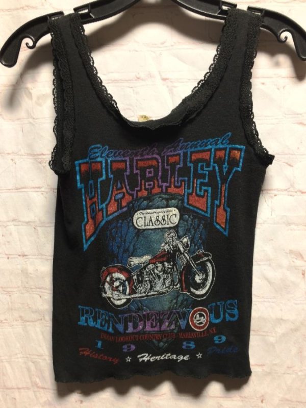 1980’s Screen Stars tank top, ribbed cotton, lace trim, 11th Annual Harley 1989 Classic, Indian Lookout Country Club, Mariaville – NY, History, Heritage, Pride, black/red/blue/white/purple, size M