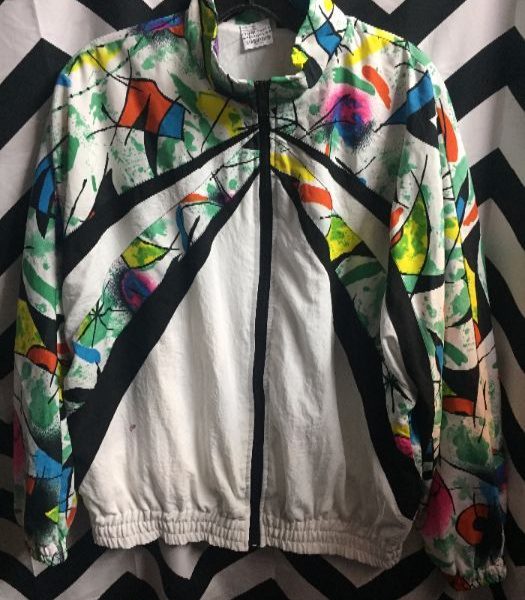 1980’s windbreaker jacket, zip-up, color block with spray paint graphic design, white/multi, size L