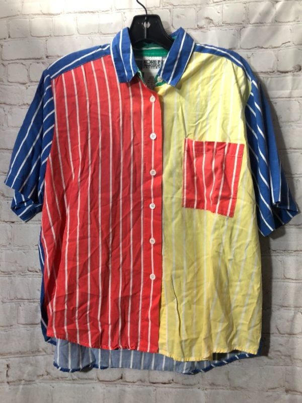 1980’s Korea Francisca shirt, short sleeves, button-up, front pocket, vertical striped pattern in color-block design, blue/yellow/red/white/green, size M