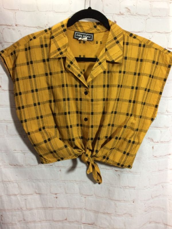 1980’s Park Avenue top, cropped, short capped sleeves, button-up, tied bottom, plaid print, mustard yellow/black, size M