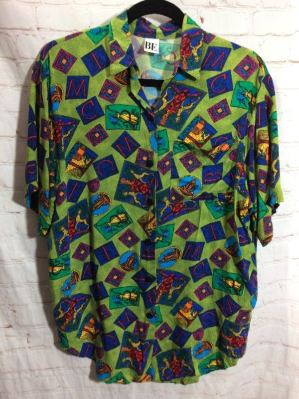 1980’s BE blouse, rayon, short sleeves, button-up, funky print with mixed Roman designs, green/blue/red/yellow/orange, size M