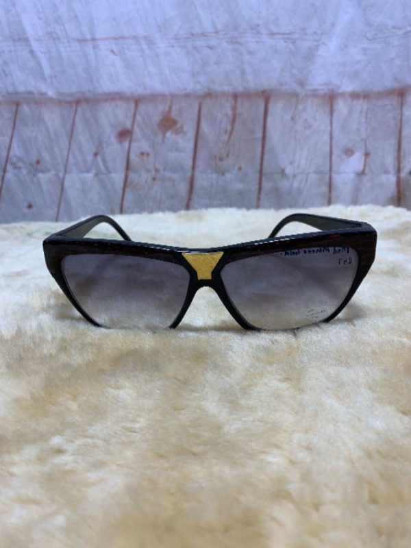 1980’s Laura Biagiotti sunglasses, geometric shaped frames with mottled pattern across brow pieces, gold metal accents, cool lenses, factory sample, black/gold/maroon/gray