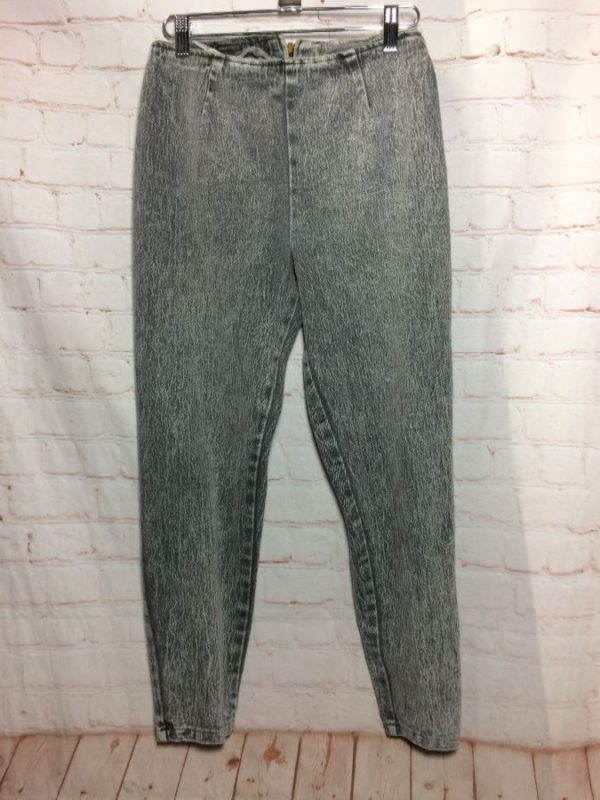 1980’s Ladies Only denim jeans, cigarette style tapered legs, back zipper & zip-up legs with bow-tie at top, acid stone wash, gray