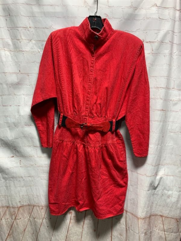 1980’s All That Jazz denim dress, twill, long sleeves, shirt length, buckled belt at waist, red/black, size 5/6