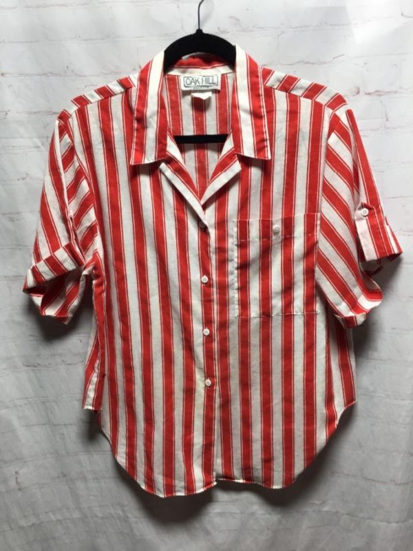 1980’s Oak Hill shirt, cotton, short sleeves with cuffs with convertible sleeve tabs , button-up, boxy fit, vertical striped print, left chest button-up pocket, red/white, size M