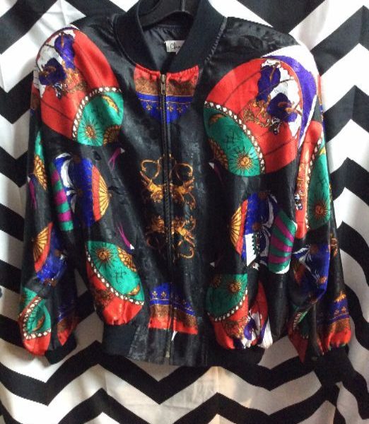 1980’s vintage bomber jacket, zip-up, Baroque style, balloon print, black/red/green/purple/multi, size L