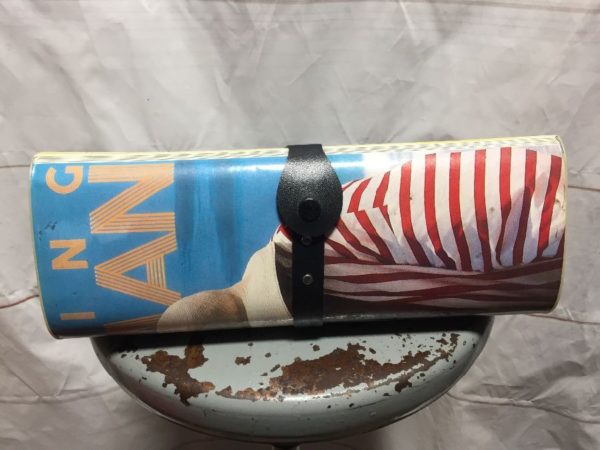 1980’S VINTAGE MISTER ERNEST INC HAND BAG, FOLDED MAGAZINE LOOK CLUTCH, CENTER WRAP AROUND LEATHER STRAP WITH SNAP CLOSURE, RED/WHITE/BLUE