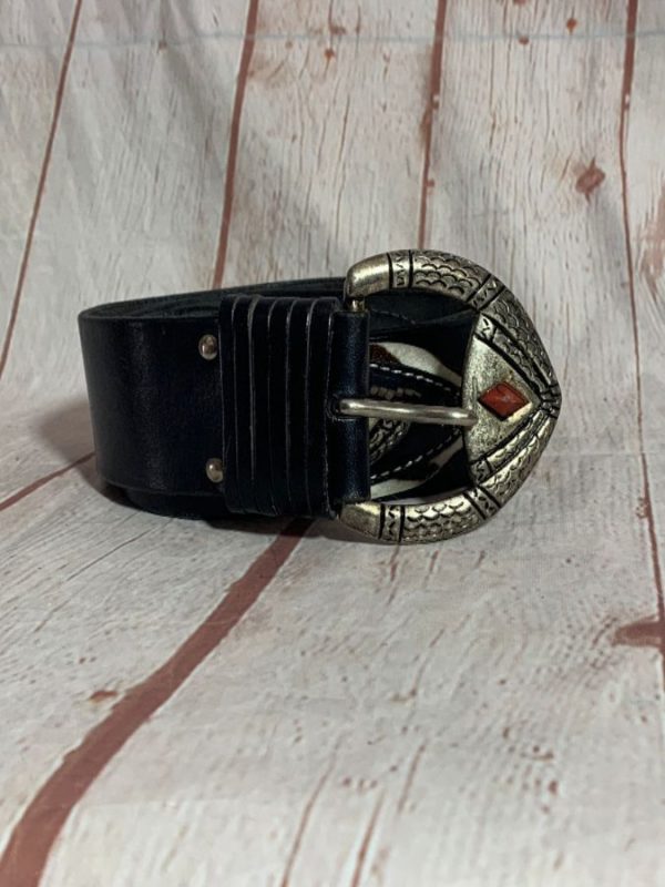 1980’S WIDE LEATHER BELT W/ ZEBRA/PONY HAIR PATCHWORK & METAL TRIBAL HARDWARE