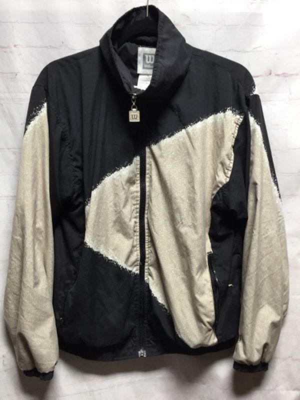 1980’s Wilson windbreaker jacket, polyester, zip-up, color-block design with fuzzy paint splatter edges, black/beige, size L