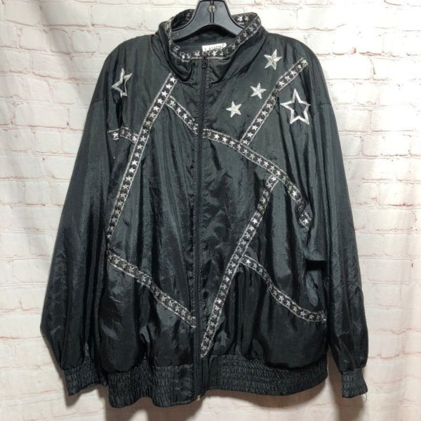 1980’s Lavon windbreaker jacket, polyester, zip-up, lined, decorative ribbon with stars in an angled patchwork style design, embellished with embroidered stars, black/white, size XL