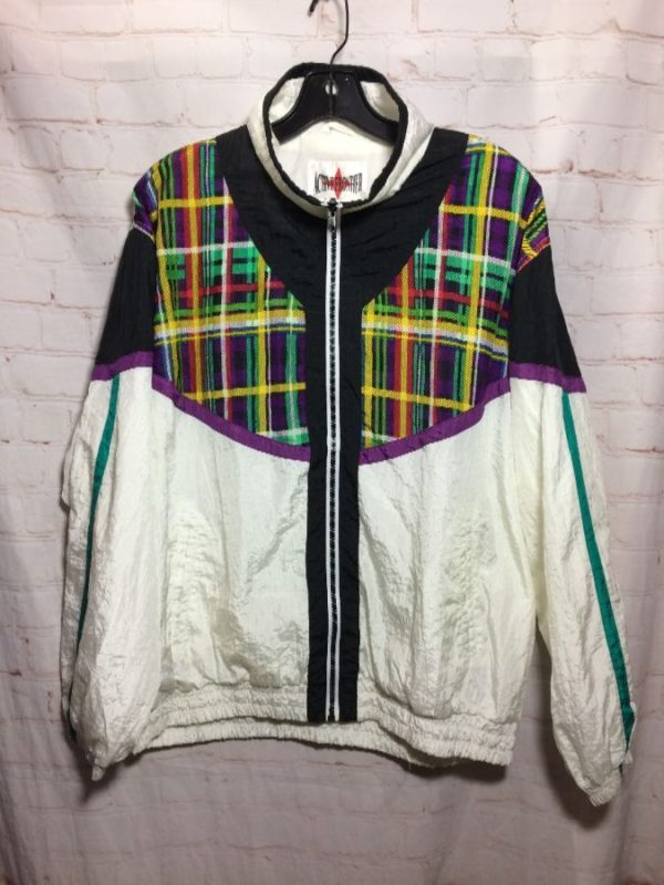 1980’S WINDBREAKER W/ FUNKY MULTI-COLORED PLAID PATTERN
