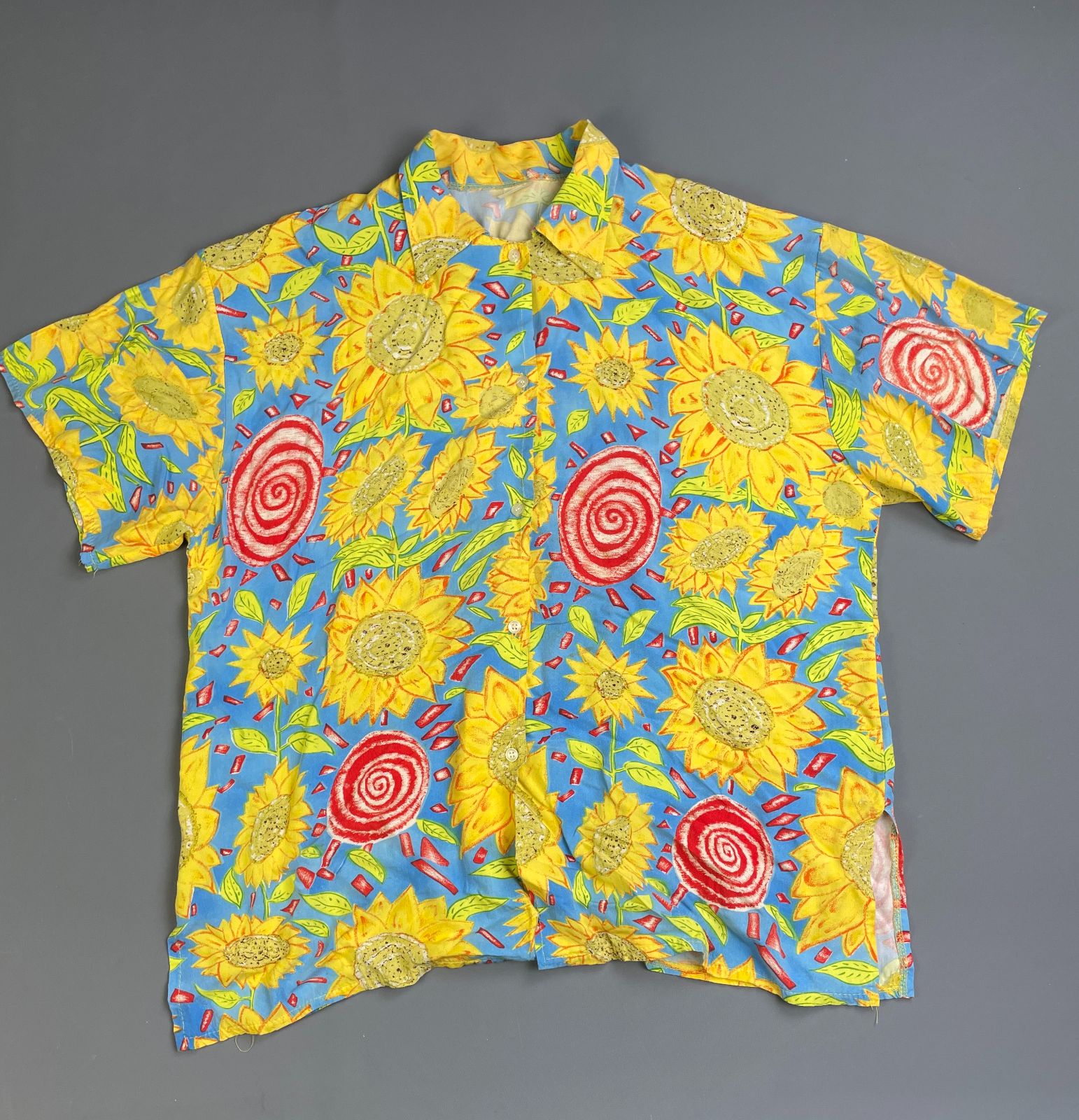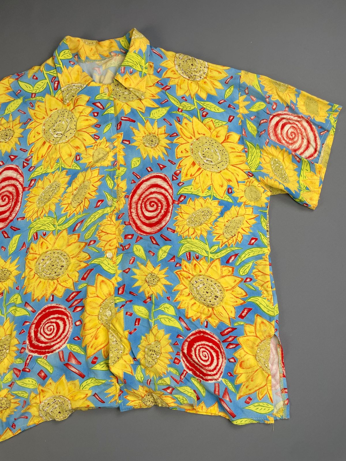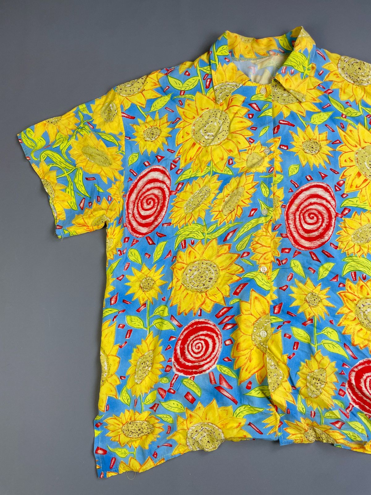 1990S 100% RAYON SUNFLOWER PRINT SHORT SLEEVE BUTTON DOWN SHIRT