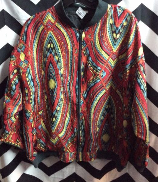 1990’s bomber jacket, Baroque style, jewel & bead printed design, contrasting cotton cuffs and collar, red/yellow/blue/black, size L