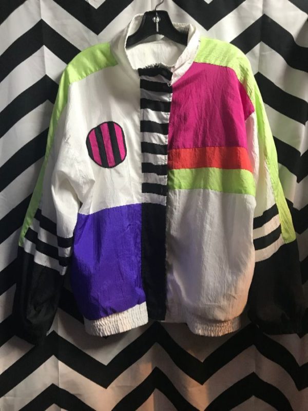 1990’s Windbreaker jacket, funky color-block shapes & stripes, white/black/neon-multi, size L