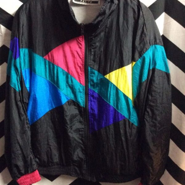 1990’s windbreaker jacket, zip-up, color block design, black/multi, size M