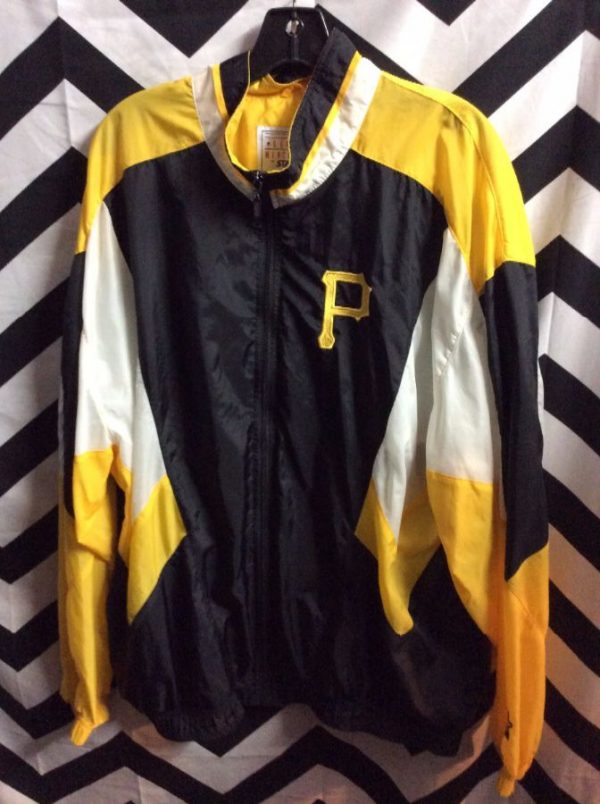 1990’s Starter windbreaker jacket, zip-up, Pittsburgh Pirates, color block design, embroidered back logo, yellow/black/white, size XL