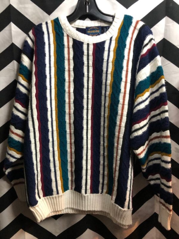1990’s pullover sweater, cotton, Coogi inspired, vertical striped design, navy/creme/green/brown, size M