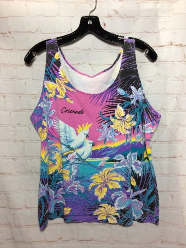 1990’S CORONADO TANK TOP, CROPPED, BRIGHT, TROPICAL BIRD & FLORAL PATTERN, PINK/BLUE/PURPLE/BLACK/YELLOW, SIZE ONE SIZE