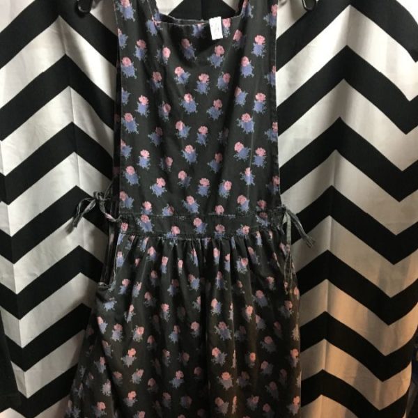 JUMPER DRESS FLORAL PRINT W/ SHELL BUTTONS ON STRAPS & FRONT POCKET
