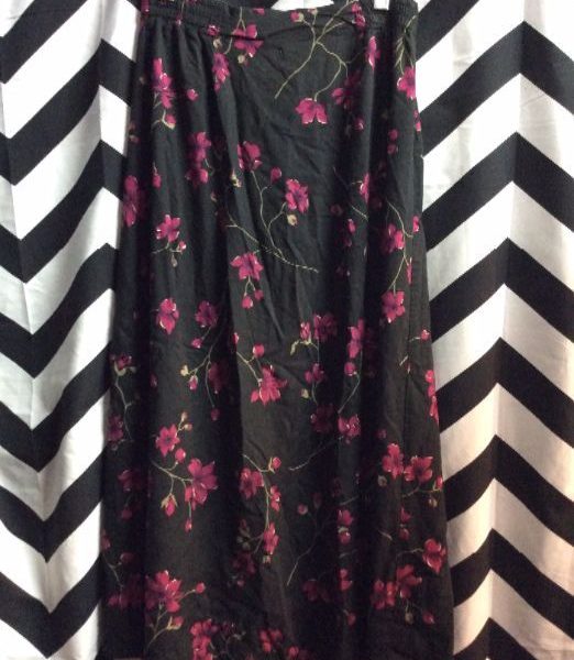 1990’s midi skirt, button-up, dark floral print, black/pink, size S