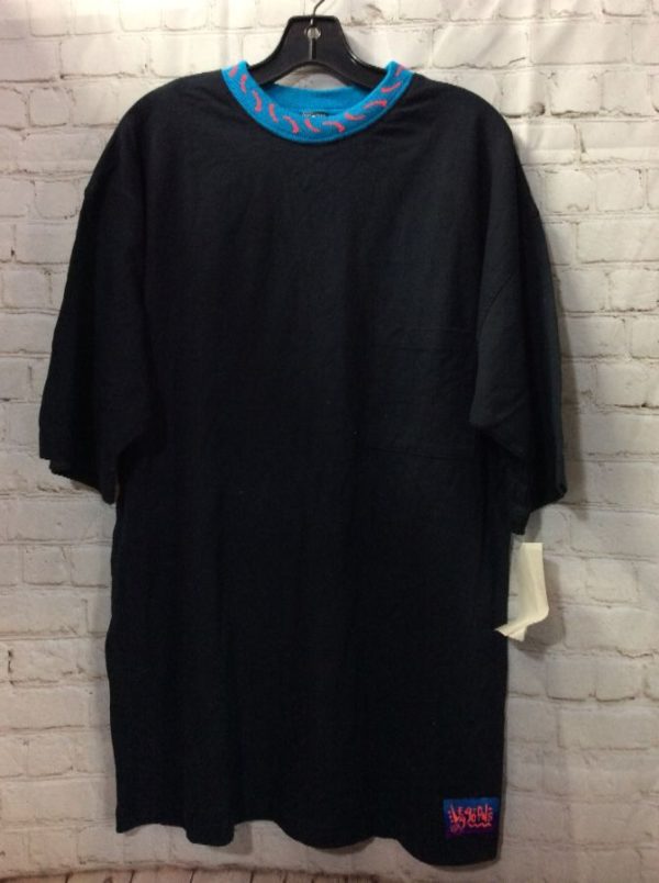 1990’s Leggoons T-shirt, pocket tee, cotton, bright geometric squiggles on collar, blue/black/hot-pink, size L