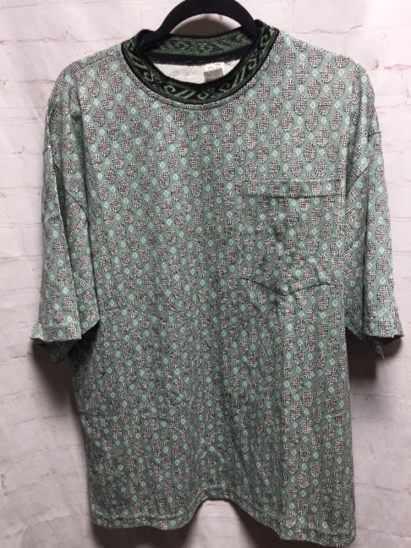 1990’S T-SHIRT, COTTON, POCKET TEE, FUNKY OVALS POLKA DOTS INSIDE & LITTLE DIAMONDS IN AN ALLOVER PRINT, DEAD-STOCK, BLACK/WHITE/SAGE GREEN, SIZE ONE SIZE FITS ALL