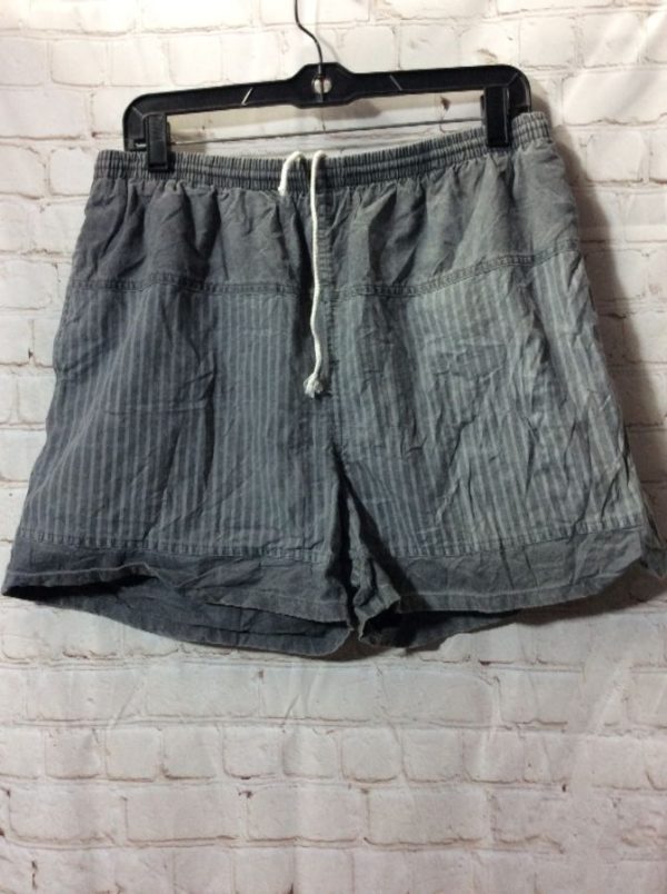 1990’s Half Moon Bay swim trunks, elastic waist with drawstring, color-block design with vertical striped center & solid color waist & hem, light gray/dark gray, size adjustable