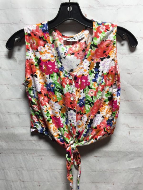 1990’s Ignite blouse, rayon, crop-top, sleeveless, button-up, tied at bottom, multi-colored floral pattern, green/blue/white/orange/red/black/pink/purple, size M