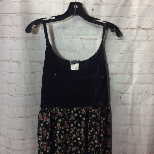 1990’s dress, maxi length, spaghetti straps, corduroy top, floral print skirt, black/creme/green/pink, size L