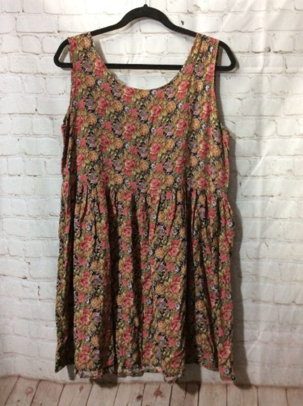 1990’s La Belle dress, baby doll style, sleeveless, scoop neck, floral print design, pink/black/tan, size L