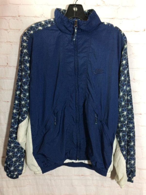 1990’s Nike windbreaker jacket, nylon, zip-up, color-block design with funky star print on sleeves & solid body, embroidered left chest logo, zip-up front pockets, blue/white, size M