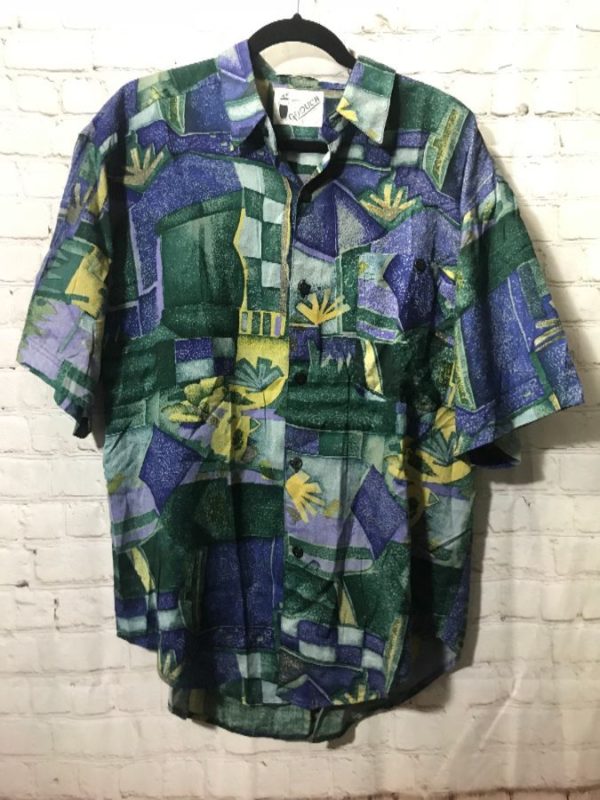 Goouch 1990’s Hawaiian shirt, rayon, short sleeves, button-up, abstract leaf geometric design print, blue/green/yellow, size L