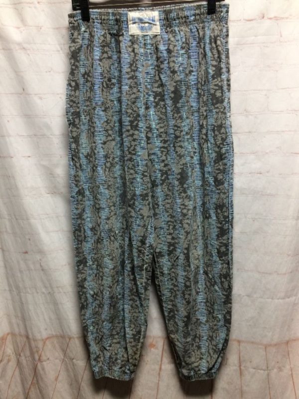 1990’s International Baggyz pants, Hammer style, elastic waist, elastic ankles, funky lines & blobs patterned design in a vertical striped print, front logo label, light gray/charcoal/blue, size one size fits all Small fit