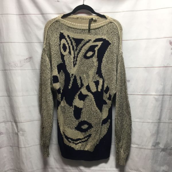 1990’S UMBERTO GINOCCHIETTI SWEATER, COTTON, BOAT NECK, MADE IN ITALY, FUNKY, ABSTRACT DESIGN IN FRONT & BACK, BEIGE/BLACK, SIZE L OVERSIZED