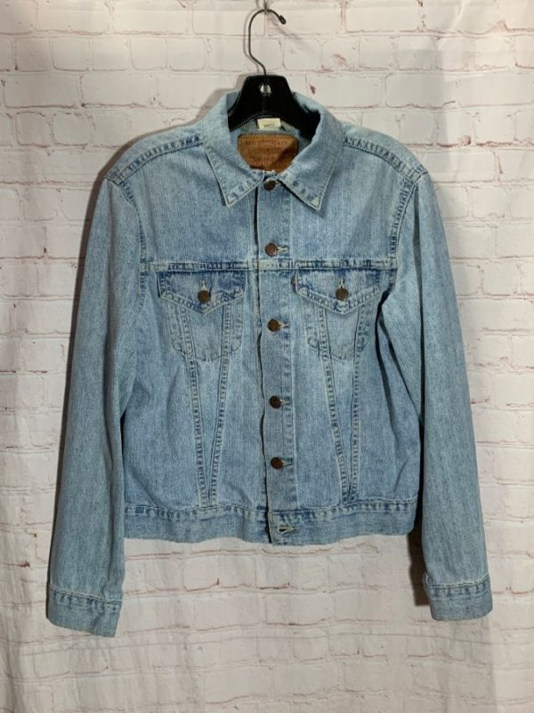 1990’s Levis denim jacket, trucker style, button-up, light weight, button-up front pockets, back tabs for adjusting fit, super light acid washed, light blue, size S