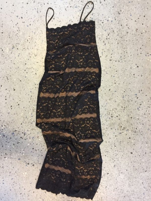 1990’s Just in time dress, pullover, spaghetti straps, long length, high slit in back, stretch lace & sheer panels, black/tan, size M