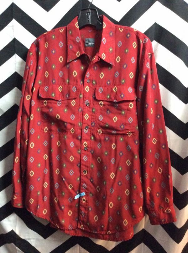 1990’s Liz Wear shirt, long sleeves, button-up, front pockets, Aztec print design, red/multi, size M