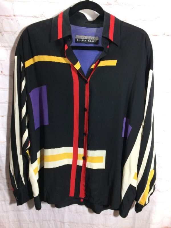 1990’s Ellen Tracy blouse, silk, long sleeves, button-up, color-block design, linear print design, black/red/yellow/white/blue/purple, size 14 As is