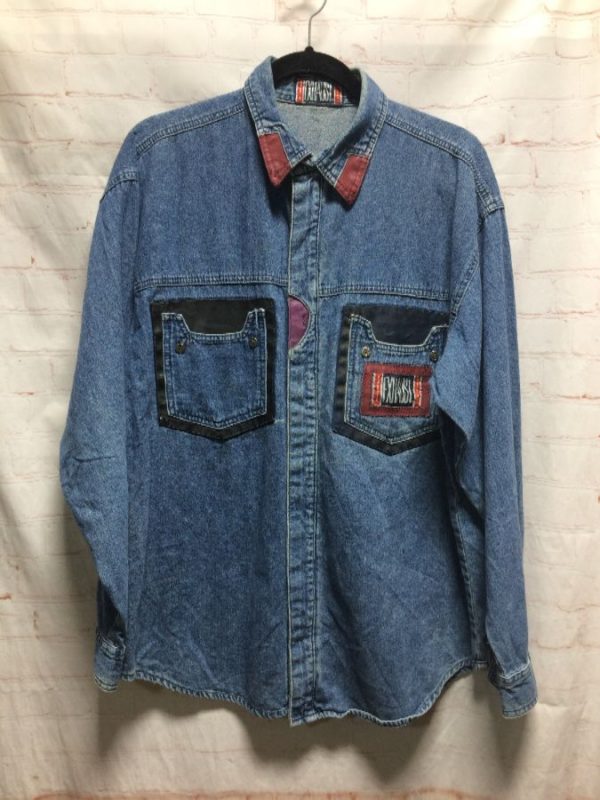 1990’S DENIM SHIRT W/ LEATHER PATCHWORK TRIM & LETTERING