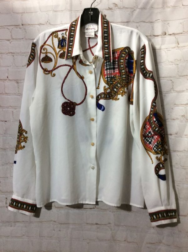 Worthington shirt, polyester, long sleeve, button-up, buttoned cuffs, Baroque design, white/blue/brown/gold/red, size 12