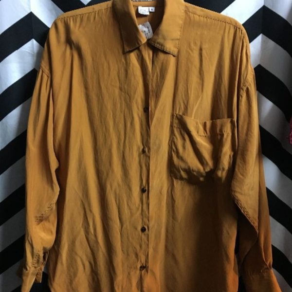 1990’s blouse, silk, long sleeve, button-up, single front pocket, solid color, mustard yellow, size M