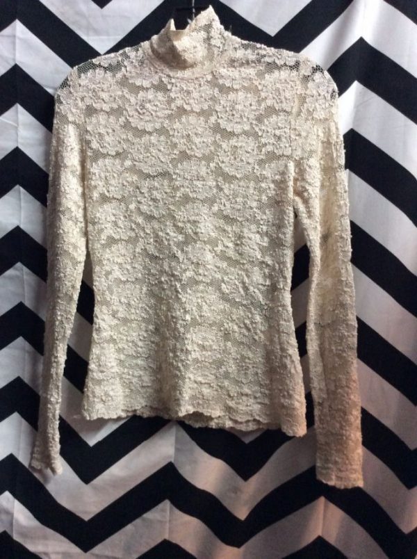 1990’s top, pullover, high neck, lace floral design fabric, creme