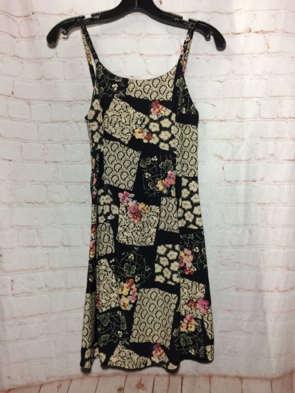 spaghetti straps, patchwork design, mixed floral & Paisley prints, black/light gray/pink/creme, size 3