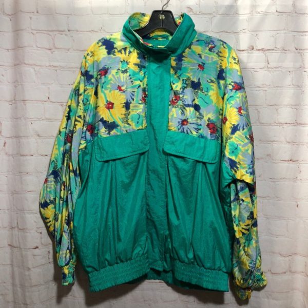 1990’s Duckster windbreaker jacket, nylon, zip-up, stand-up collar, floral sunflower print and solid colors, color-block design, 2 large front pockets, turquoise/yellow/blue/rust, size XL